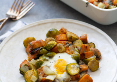 ¡Esta receta de huevos horneados y papas dulces es un plato tan versátil que se puede comer para el desayuno o la cena! ¿A quién no le gusta una receta que sólo requiere un poco de picado y luego tirar todos los ingredientes en una sartén? Las batatas, los huevos, las coles de Bruselas, el queso azul y las cebollas son todos yo