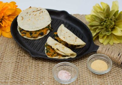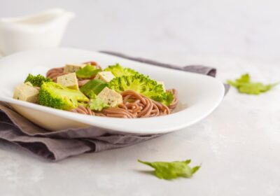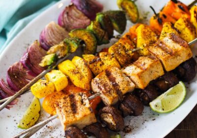 Receta de brocheta de tofu tropical vegano con aguacate y mango. Leer el artículo